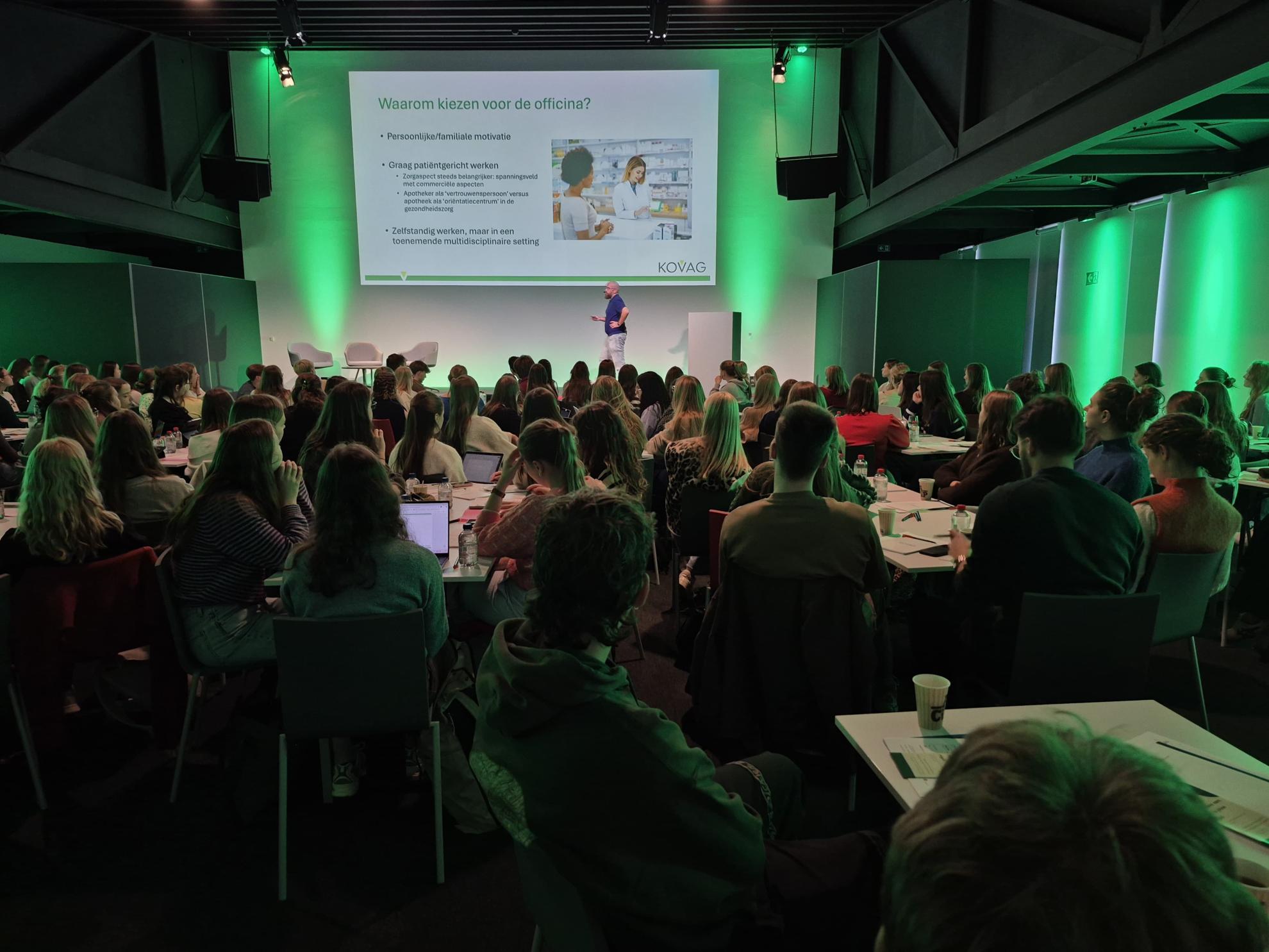 Een dag later, op donderdag 25 september, vond in Gent de eerste stagedag van KOVAG plaats. De timing kon niet beter, want het was ook Werelddag van de Apotheker. Voorzitter Pim Lemmerling verwelkomde maar liefst 169 studenten van de Universiteit Gent en stelde de beroepsvereniging voor.