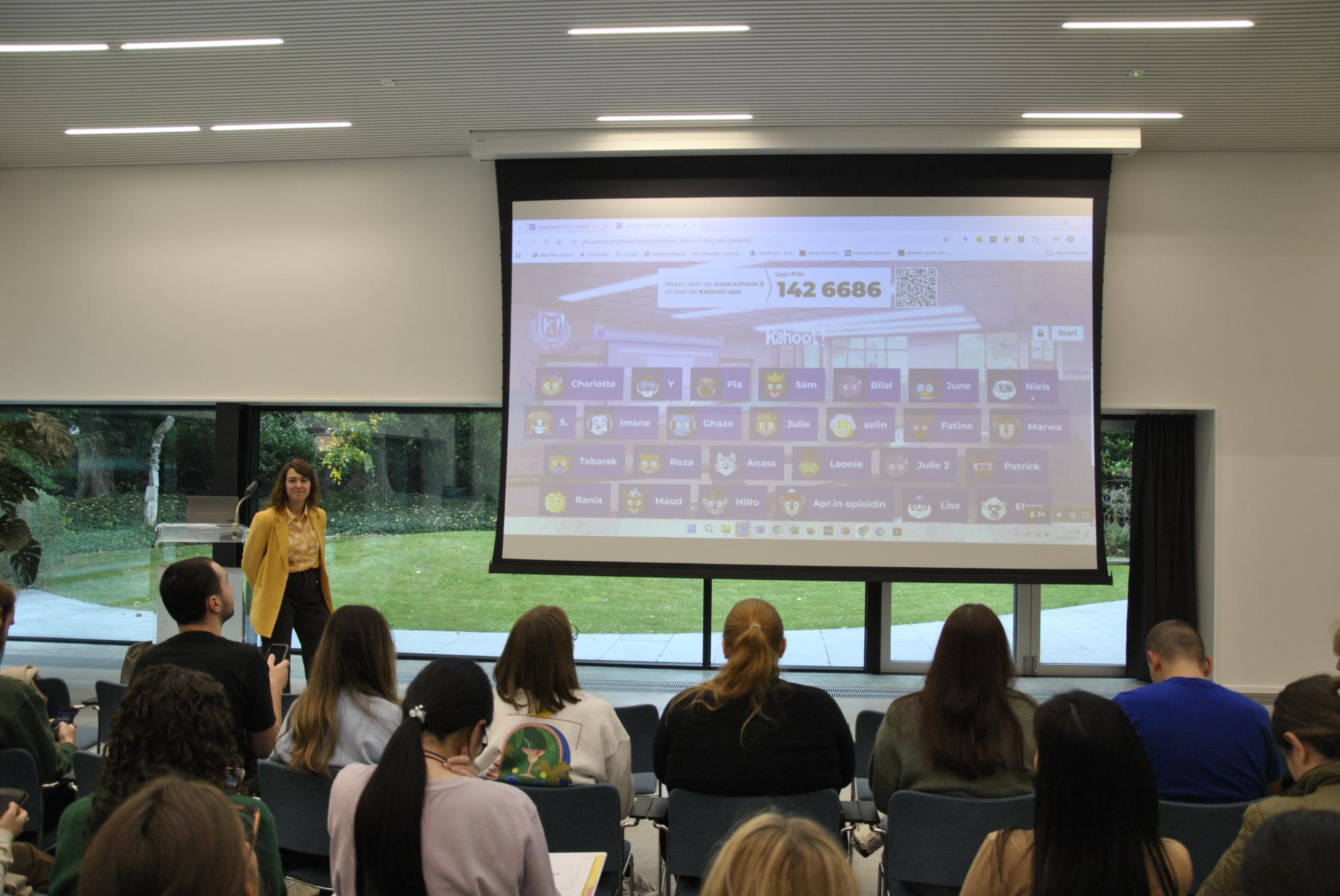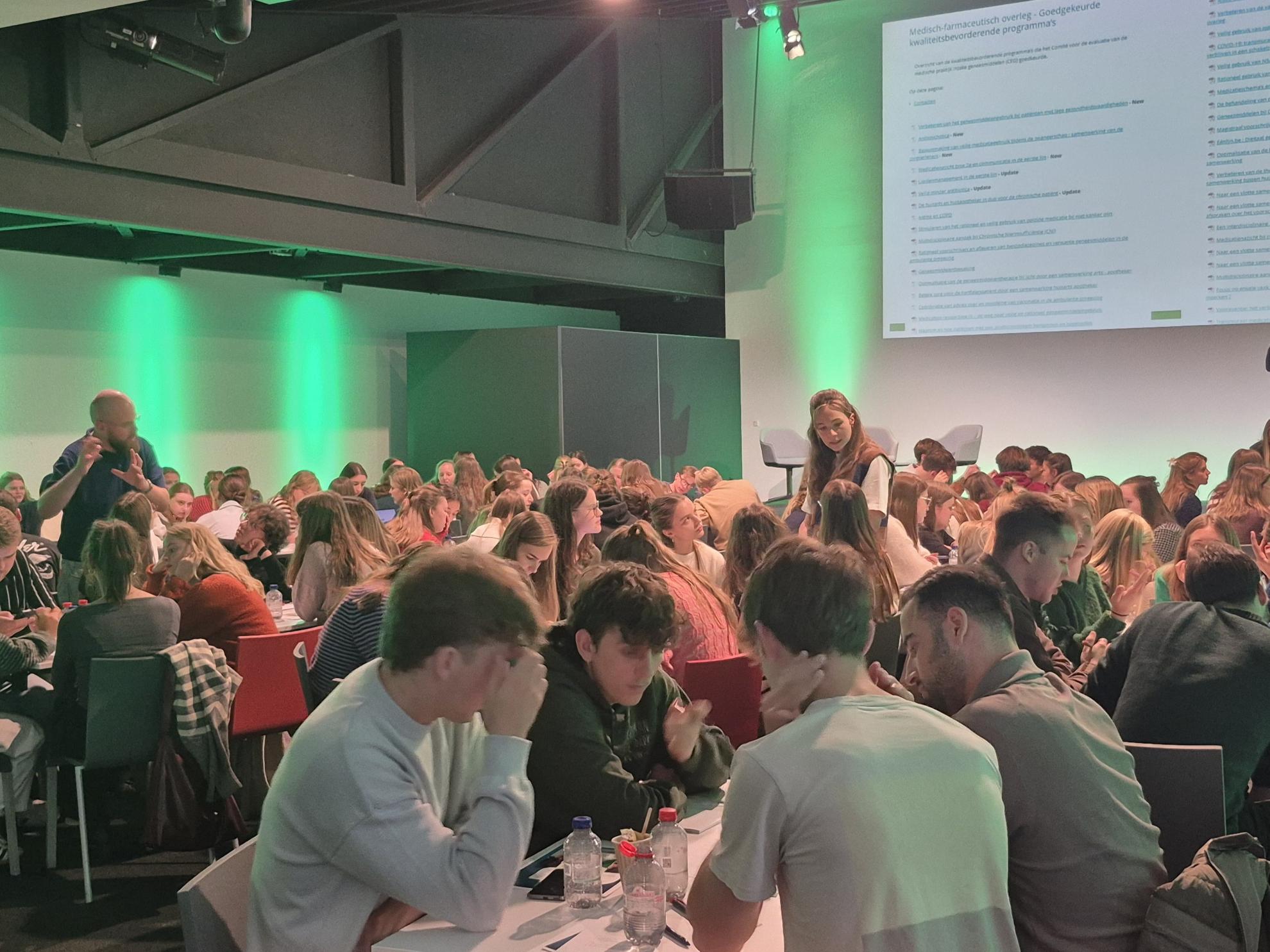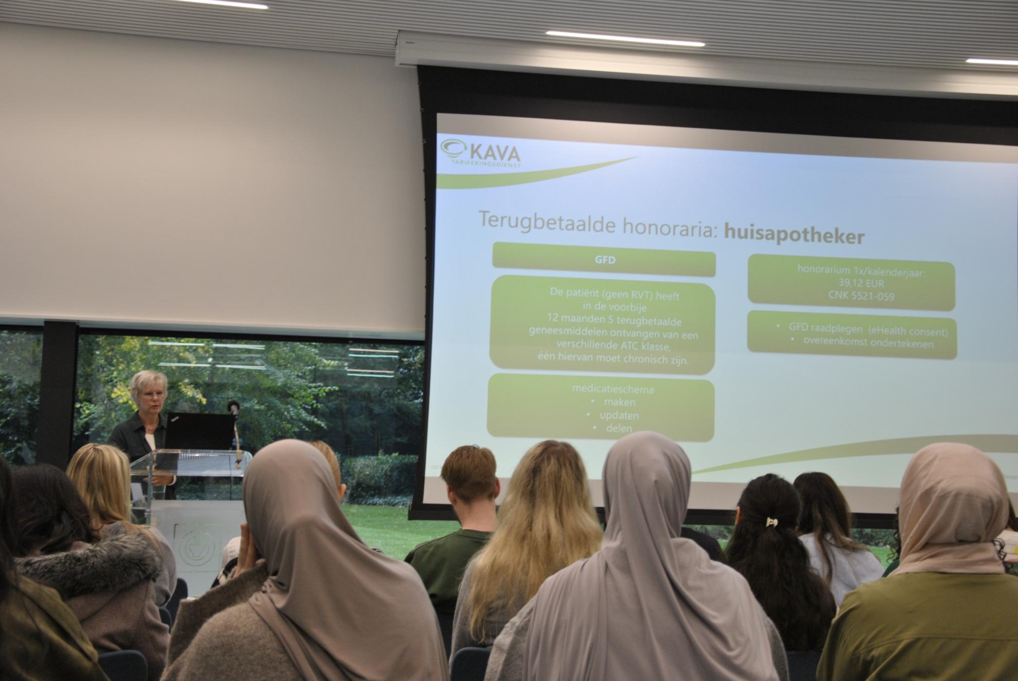 Het grootste deel van de dag stond in het teken van tarifering, terugbetaling van geneesmiddelen, magistrale bereidingen en diensten in de apotheek. Belangrijke kennis voor studenten die momenteel volop bezig zijn met hun apotheekstage. Daarna volgde een sessie over het medisch-farmaceutisch overleg, waarin de studenten zelf een MFO-thema mochten uitwerken en presenteren.